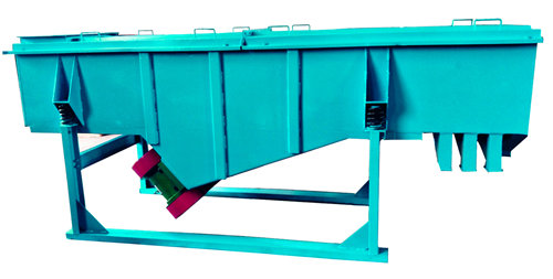 MZS系列直线振动筛是由振动电机、筛箱、筛网、传振体、减振装置组成。当纵向安装在筛体上的两台卧式振动电机相对转动时。两台振动电机两端的偏心块便产生额定激振力,其产生在横向的激振力互相抵消,其纵向的激振动力通过传振体传递到整体筛面上,从而使筛面上的物料受其激振力而在筛网面上向出料口方向跳跃运动。小于筛孔的物料通过筛孔落到下层,大于筛孔的物料会被拦截再网上,之后物料经连续跳跃后经出料口流出,完成物料的分级作业。